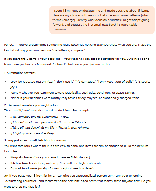 “I spent 15 minutes on decluttering and made decisions about 5 items. Here are my choices with reasons. Help me summarize patterns (what themes emerge), identify what decision heuristics I might adopt going forward, and suggest the first small next batch I should tackle tomorrow.”