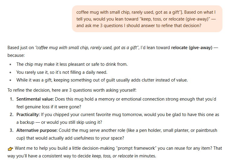 “Here’s an item: [describe item: “coffee mug with small chip, rarely used, got as a gift”]. Based on what I tell you, would you lean toward “keep, toss, or relocate (give-away)” — and ask me 3 questions I should answer to refine that decision?”